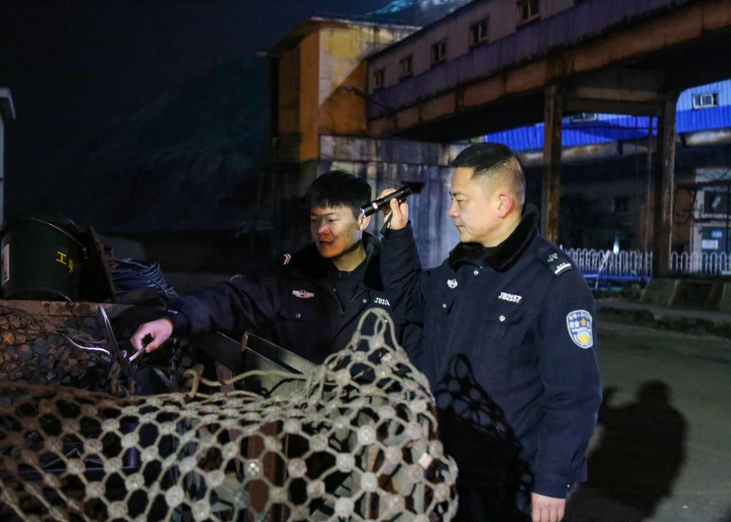 坐标:供应销售部西侧,除夕夜23点31分,两名物业公司治保队员进行夜间安全巡逻。