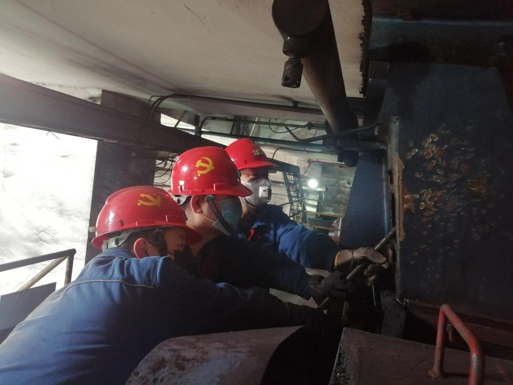 这一幕是涡北选煤厂生产班班长正在安排一项“苦脏累”的突击任务。涡北选煤厂有六个万吨级原煤仓,24落煤仓眼,由于春节长假,潮湿的原煤在水与泥的作用下,在仓壁上面板结硬化形成一个“假底”,高高的悬空蓬死在原煤仓內,犹如筑城的夯土,仓內空气炮也奈何不了它们。众所周知,捅仓这活是又脏又累,而且有时候忙了一天都捅不下来一个仓眼,上万吨原煤就在仓里,却无法正常进入生产系统,生产处理量无法稳定,质量控制难以保证,生产能耗不断增加。当天,三名党员与蓬仓眼进行了一场顽强的搏斗,最终把蓬仓贯通,为原煤稳定洗选创造了重要条件。