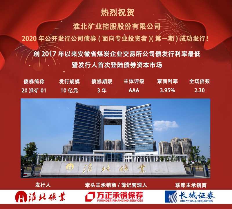 10月20日,淮北矿业2020年公开发行公司债(面向专业投资者)(第一期)成功发行,本期债券发行规模10亿元,期限3年,票面利率3.95%,认购倍数2.3倍。