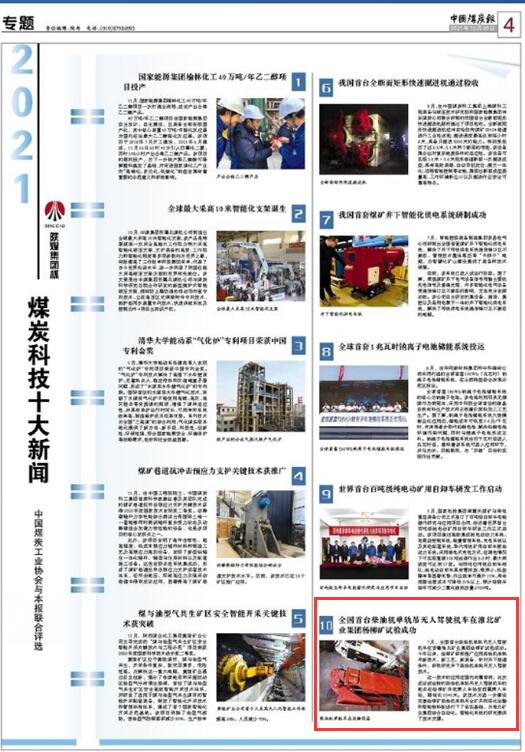 日前,由中国煤炭工业协会和《中国煤炭报》共同评出的“2021煤炭科技十大新闻”揭晓,《全国首台柴油机单轨吊无人驾驶机车在淮北矿业集团杨柳矿试验成功》新闻荣膺榜中。