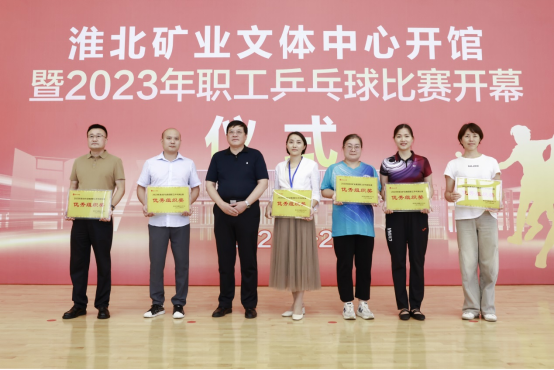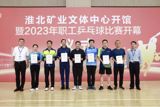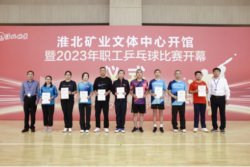 在中秋、国庆来临之际,9月26至27日,淮北矿业集团在新落成的文体中心举办“喜迎国庆、‘乒’搏有你”2023年职工乒乓球比赛,经过两天的激烈比拼,决出了男子团体、女子团体、男子单打、女子单打、优秀组织奖等各类奖项,集团工会第一副主席刘杰和工会、物业分公司相关负责人为获奖单位和选手颁奖。