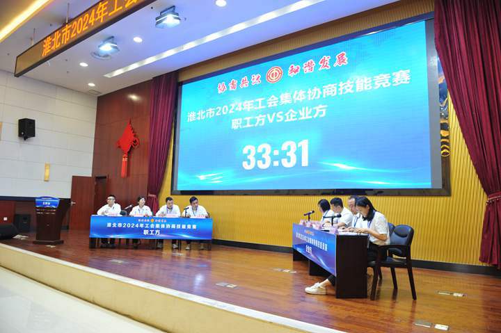 竞赛以“协商共识、和谐发展”为竞赛主题,旨在充分发挥集体协商制度在协调劳动关系中的重要作用,锤炼一支高素质、善沟通、会协商、有担当的集体协商人才队伍,切实提升淮北市集体协商质量,促进劳动关系和谐稳定。此次竞赛汇集了全市各县区、行业工会及淮北矿业集团、皖北煤电集团、中煤矿建集团、淮海实业集团10支代表队伍,他们围绕职工权益维护、福利待遇等问题,在模拟场景中进行集体协商,由评委组对协商呈现效果进行专业点评。各支参赛队伍围绕“协商共识、和谐发展”活动主题,依据理、法、情,透彻分析案例、准确运用政策、缜密逻辑推理、合理设置身份、流畅配合协作,各抒己见,据理力争,较好展示了参赛队伍的风采,比赛现场气氛热烈,紧张有序。竞赛评定团体一等奖、二等奖、三等奖和个人奖项“最佳协商员”“优秀协商员”“协商能手”,同时设置优秀组织奖。