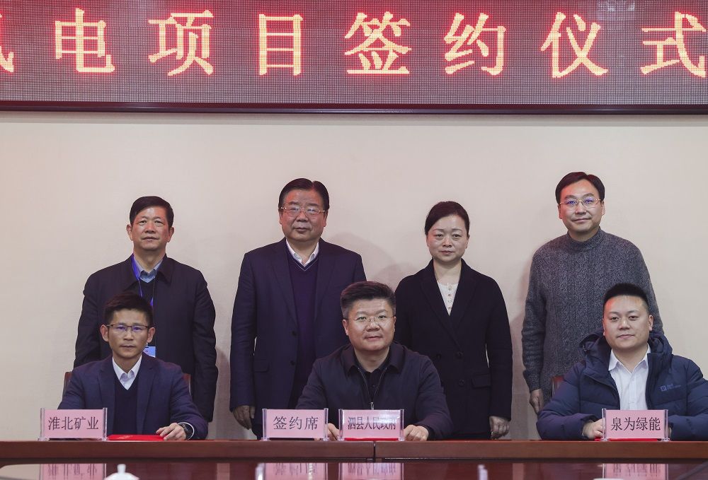 2月14日,淮北矿业集团与泗县人民政府、泉为绿能投资(海南)有限公司举行三方签约仪式,顺利签约300兆瓦泗县风电项目。淮北矿业集团党委副书记、总经理孙方,淮北矿业副总经理陈亚东;泗县县委副书记、县长王汝娜,县委常委、副县长王跃明,以及泉为绿能投资(海南)有限公司、上海赢古资产管理公司负责人出席了签约仪式。