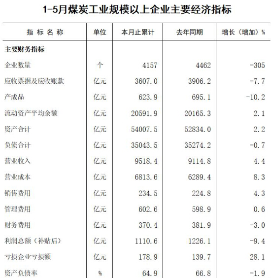 1-5月规模以上煤炭企业主要经济指标完成情况