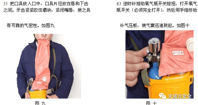 1)佩戴时将自救器移至右前方,左手拖住自救器底部,右手打开保护套,用大母指用力搬开开启扳手;