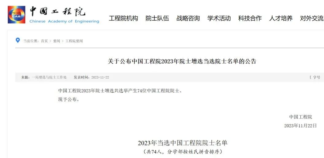 11月22日,2023年两院院士增选结果正式揭晓,共有133人当选。中国科学院增选院士59人,中国工程院增选院士74人。煤炭领域2人当选中国工程院院士。分别是: